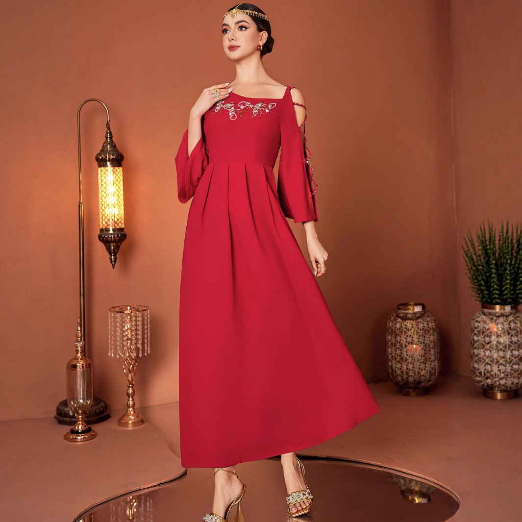 Red Designer Model Heavy Industry Hand Sewing Drill Off-the-shoulder Dress